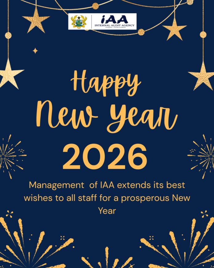 HomeEvents Events IAA WISHES ITS STAKEHOLDERS A HAPPY NEW YEAR By Bernice Lamptey December 31, 2025 0 16 FacebookTwitterPinterestWhatsApp Management and staff of the Internal Audit Agency wish its cherished stakeholders a Happy New Year in advance. Previous articleCHRISTMAS MESSAGE Related Articles Events CHRISTMAS MESSAGE Uncategorized MERRY CHRISTMAS TO ALL OUR CHERISHED STAKEHOLDERS Events IAA SWEARS IN GMA AUDIT COMMITTEE: STRENGTHENING GOVERNANCE & ACCOUNTABILITY Latest Articles Events CHRISTMAS MESSAGE Uncategorized MERRY CHRISTMAS TO ALL OUR CHERISHED STAKEHOLDERS Events IAA SWEARS IN GMA AUDIT COMMITTEE: STRENGTHENING GOVERNANCE & ACCOUNTABILITY Events DRIVING TRANSPARENCY: IAA IN STRATEGIC ENGAGEMENT WITH IAF HEADS OF MDAS (SESSION 2) Events CHARTING THE PATH OF GOOD GOVERNANCE: NCA AUDIT COMMITTEE INAUGURATED Load more